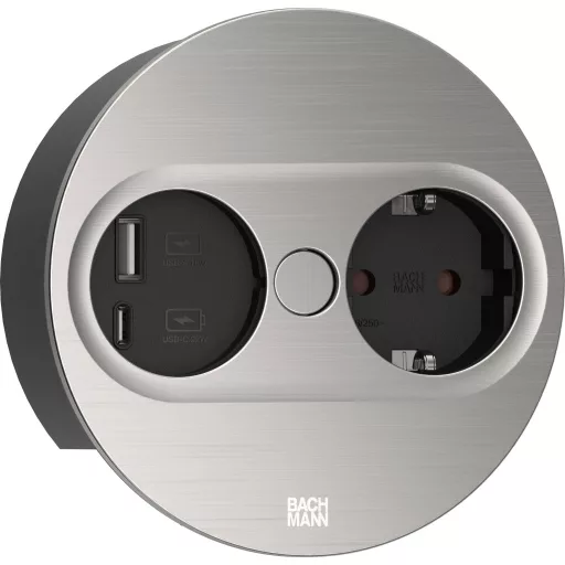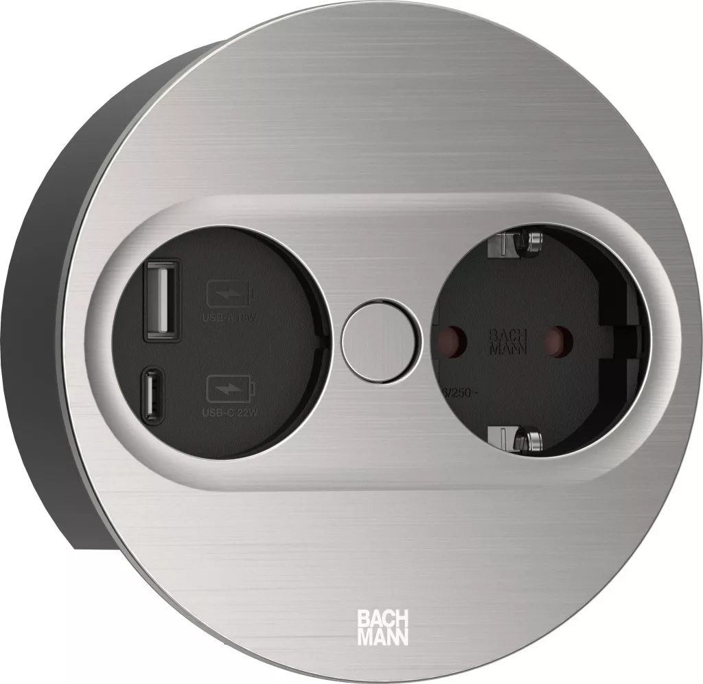 TWIST 2 Fém fedőlemez, kerek rozsdamentes acél megjelenés, 1x védőérintkezős aljzat fekete színű fokozott érintésvédelemmel, 1xUSB A/C 22W töltőkábel 2,0m H05VV-F 3G1,5mm² fekete, vezetékvéghüvellyel és védőérintkezős csatlakozódugóval csomagolva. doboz.