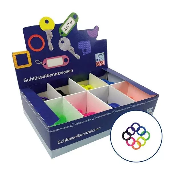 Kerek kulcstartók a kulcsok vagy a kulcstartó jelölésére és azonosítására. Az azonosító gyűrűk már szín szerint rendezve vannak az értékesítési kijelzőn. Összesen 8 különböző világító színben - 1 eladó egység = 200 db. Az élénk színű kulcsazonosító gyűrűnek köszönhetően a kulcs ideálisan jelölhető. Alkalmas kerek kulcsfejjel rendelkező kulcsokhoz.
