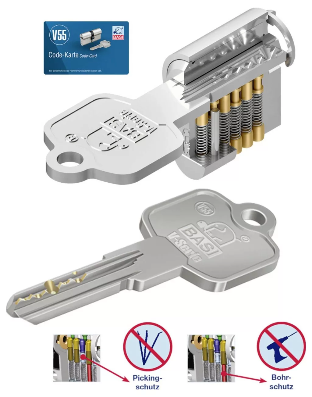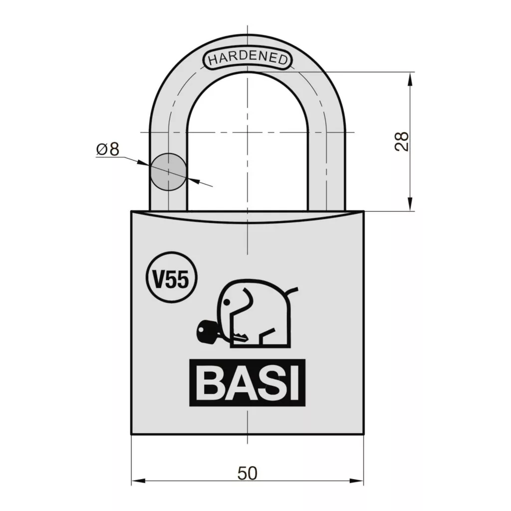 A BASI V55 sorozatába tartozó tömör lakat integrált profilhengerrel kiváló minőségű sárgaréz házból és edzett acél kengyelből áll. A zár olyan tárgyakat rögzít, mint a kapuk, ajtók, szekrények, szekrények, fészerek vagy pinceajtók. A biztonsági zárhoz 5 megfordítható kulcc tartozik. A belső profilhenger 6 tűs buktatót tartalmaz, így az esetleges repedés / heves nyitás megnehezíthető. Különféle kulcsos rendszerrel van felszerelve – minden zár csak a mellékelt kulcsokkal kompatibilis.