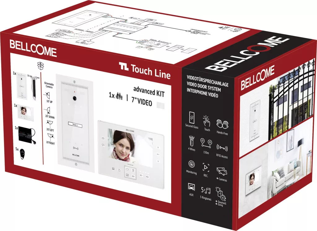 Jellemzők: RFID funkció · Touch technológia · Infravörös világítás éjszakai látáshoz · Lopás elleni védelem · Hívás és beszélgetés hangerő beállítása: 7 szint és némítás · Csengőhang kiválasztása: 5 lehetőség A hívás időtartamának kiválasztása: 1/2/3 hívás vagy 1 perc. · Videokép beállítása: fényerő és színárnyalat · Zárási idő: 1 - 10 sec. · Mentés / törlés funkció a címkékhez · A kamera videó üzemmódja: csak működés közben vagy tartósan · A piros LED be- és kikapcsolása jelzi a monitor jelenlétét · Lehetséges meghosszabbítások: 3 típusú ajtónyitó: egyenáramú ajtónyitó (12 V / max. 1 Ad.c.), váltakozó áramú ajtónyitó (max. 24 V / max. 5 Aa.c.) és elektromágneses ajtónyitó (max. 24 V / max. 5 Ad) .c.) · Külső zárkioldó gomb · Kiegészítő parancs: bejárati kapu, garázskapu, külső világítás vagy bármilyen más automatika (max. 24 Vd. / Ac max. 5 Ad.c. / ac) · 1 külső videokamera, amely közvetlenül a tápegységről van csatlakoztatva és táplálva · Legfeljebb 4 külső videokamera videokapcsolóval · Videofelvevő (DVR) képek készítéséhez · A csengő a beltéri egységhez csatlakozik · Akusztikus (gong típusú) vagy optikai hívásjelző eszköz a beltéri egységhez csatlakoztatva · Legfeljebb 3 további video és audio beltéri egység · Akár 3 további kültéri egység a többszörös hozzáférésű kapukhoz (videó választó dobozzal) · Videokép beállítása: fényerő és színárnyalat · Hozzáférés a címkék tárolásához / törléséhez · Videokamera üzemmód: csak használat közben vagy folyamatosan · A monitor jelenlétét jelző piros LED be- / kikapcsolása
