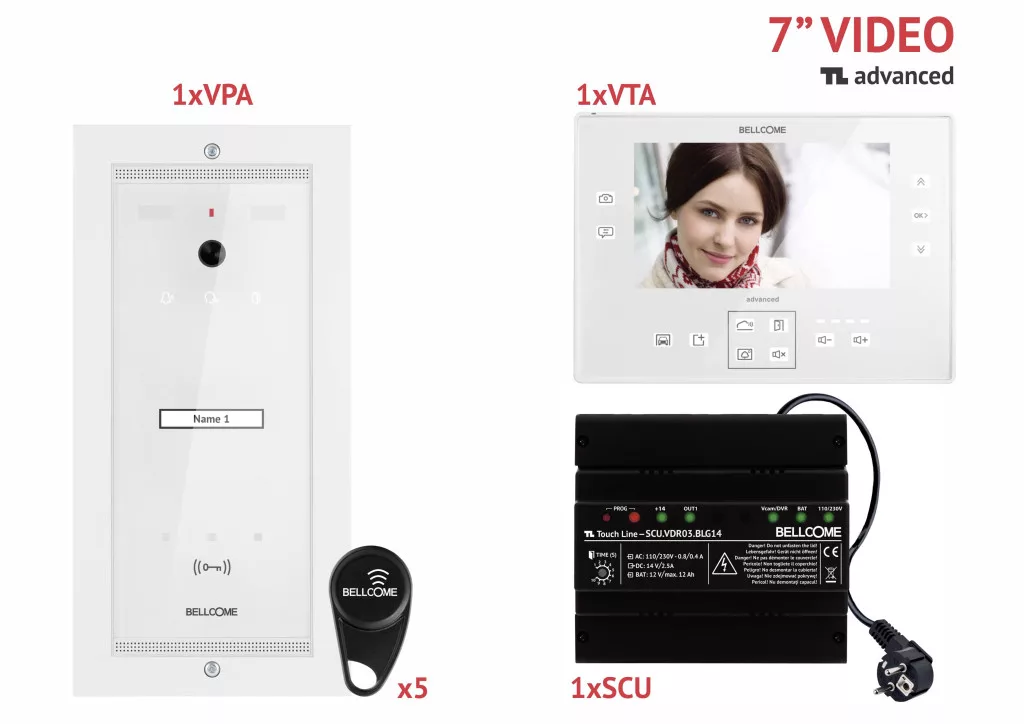 Szállítás tartalma: Fejlett kültéri videoegység · Haladó 7 ”-os beltéri videó egység · Videó tápegység egy kimenettel · 5x biztonságos RFID címke · Utasítások