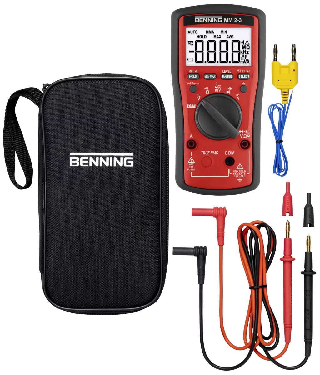 TRUE-RMS digitális multiméter BENNING MM 2-3 alkalmas elektrotechnika, ipar, szerviz, kereskedelem, gépjárművek, fotovoltaikus berendezésekhez. A 4 számjegyű LCD kijelző (6000 képpont) világít.