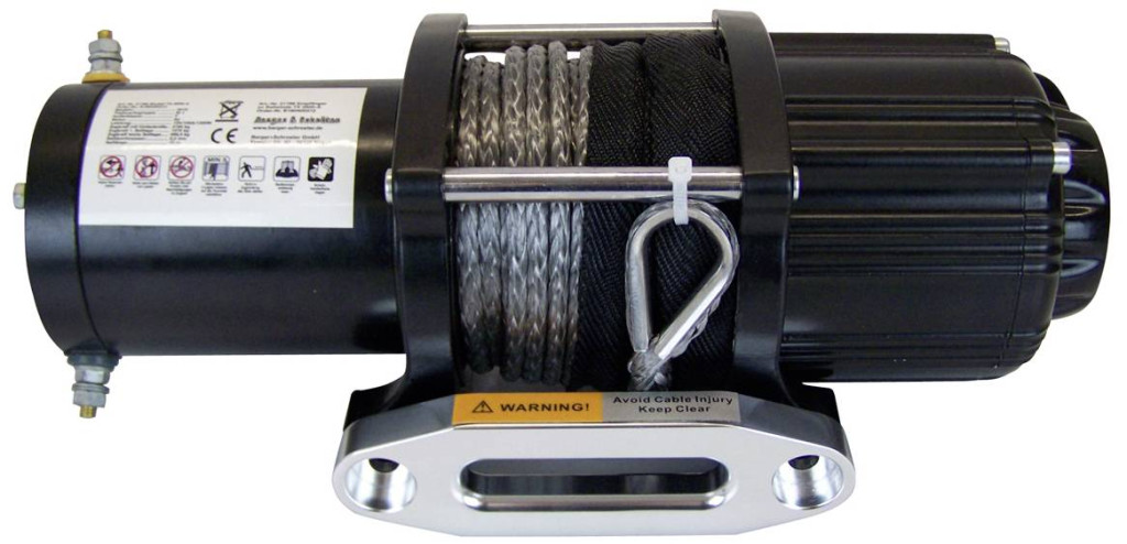 12 V-os motoros csörlő szintetikus kötéllel, 3150 kg-ig húzó erővel.