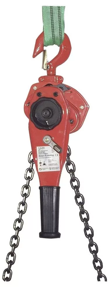 Jellemzők: Ipari minőség · GS által bevizsgált biztonság · Kompakt, sima felépítés · Problémamentes láncvezető · Kovácsolt kampók és nagy szilárdságú láncok · Használható húzási magasság kb. 1,4 m · 1000 kg-os teherbíráshoz · Csak kb. 7 kg nehéz · Minimális horogtávolság 35 cm · LxWxH = 43x14x17 cm