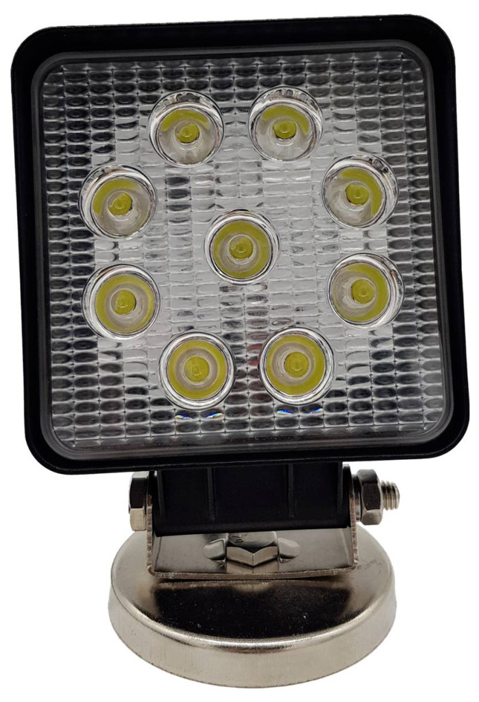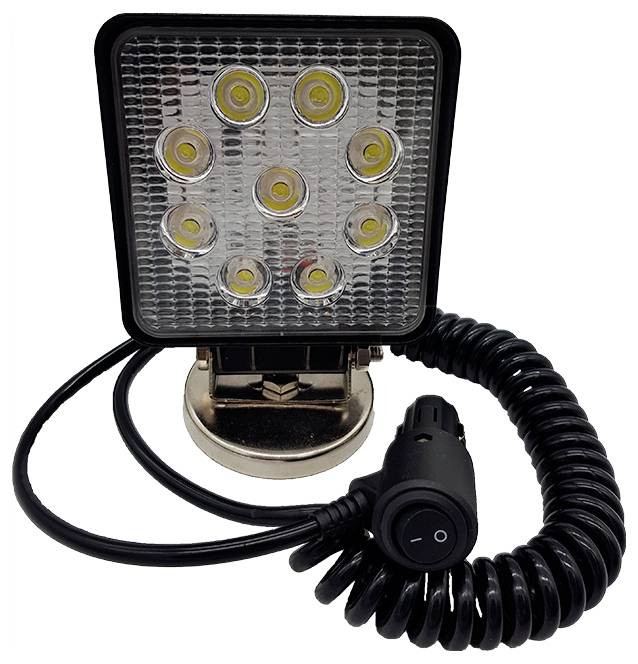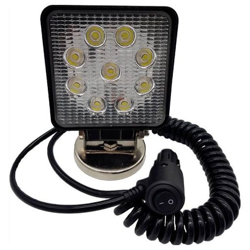 LED munkalámpa négyzet, 9x3 W, kb 2160 lumen, mágneses talppal, ház alumínium, üveg polikarbonát, műszaki adatok: fényforrás: 9 x nagy teljesítményű LED Epistar, teljesítmény: 27 watt (9 x 3 watt), feszültség: 10-30 m, 3 V spirálkábel 16 volt kb öngyújtó be/ki kapcsolóval, méretek (SzxMxM): kb. 117 x 150 x 75 mm, élettartam: kb. 30 000 óra, közeli szórólencse 60° (rövid és széles), világos szín 6000K, ECE R10.