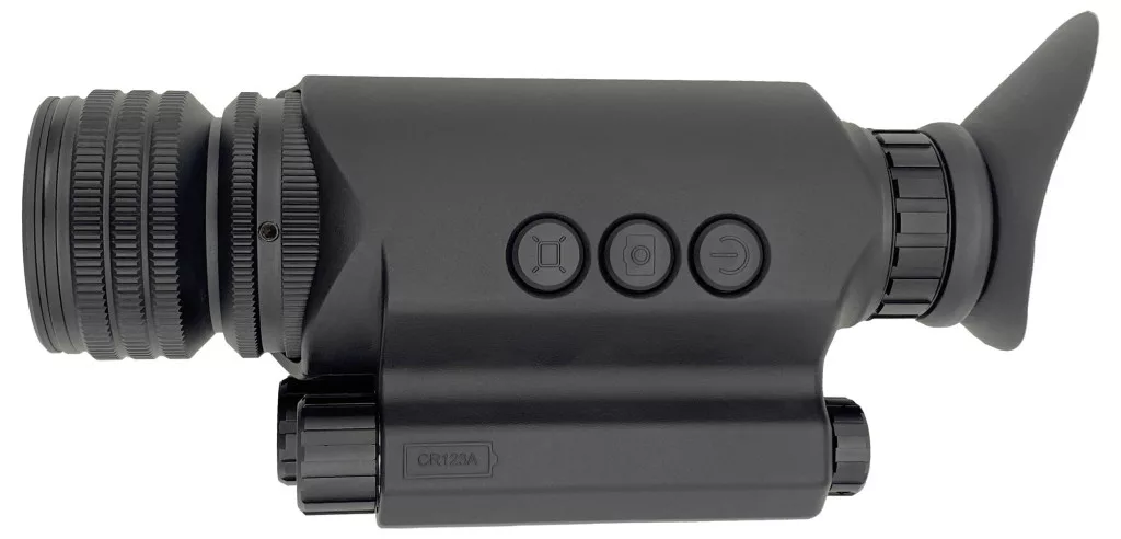 Technical specifications: Infra kiegészítő fény: Igen · Kivitel (optika): Monokuláris · Max. megfigyelési távolság: 450 m · Méret, hossz: 165 mm · Méret, magasság: 60 mm · Méret, szélesség: 80 mm · Súly: 495 g · Tápellátás: 2 db CR 123 lítiumelem (nem szállítjuk vele)