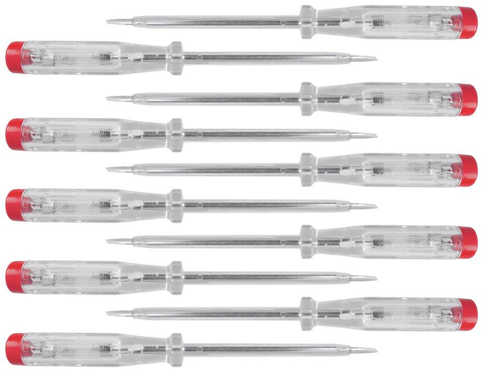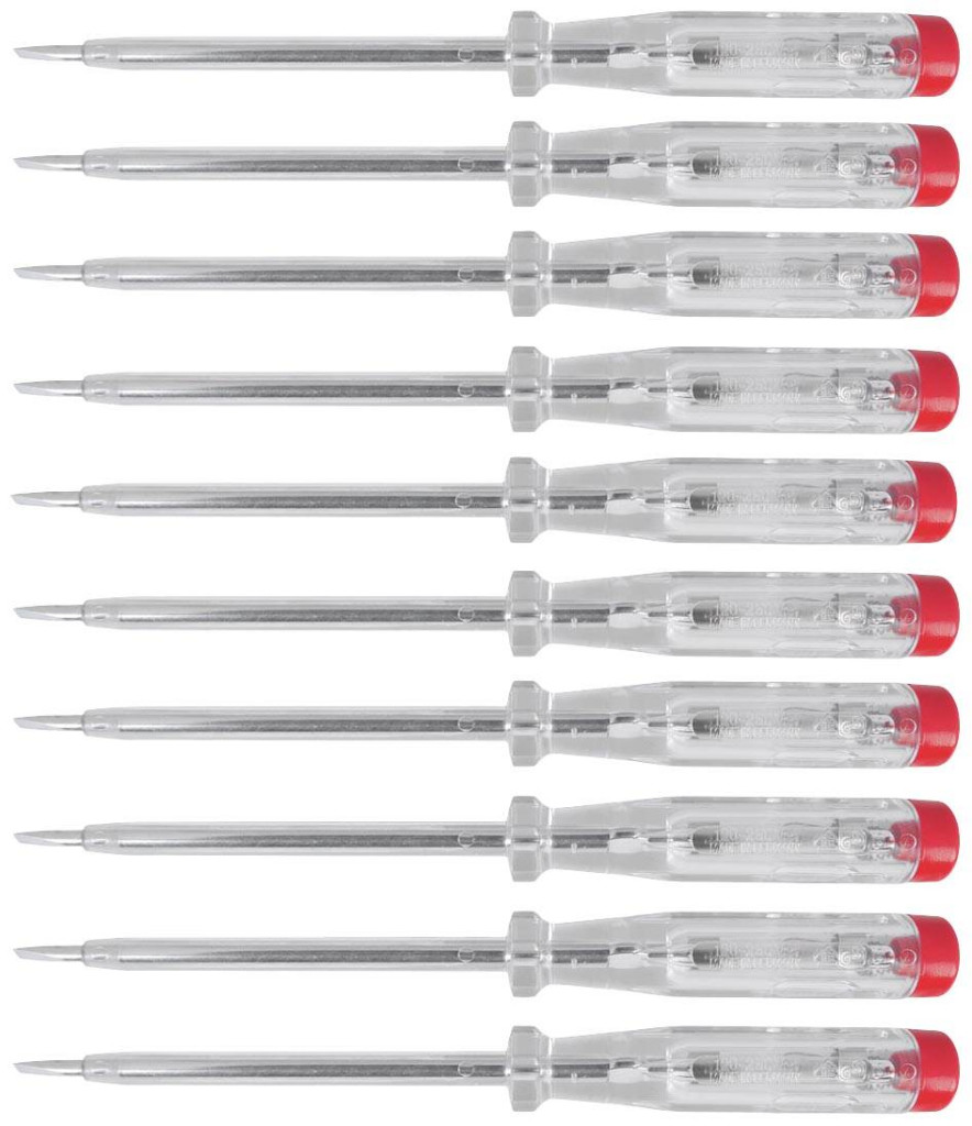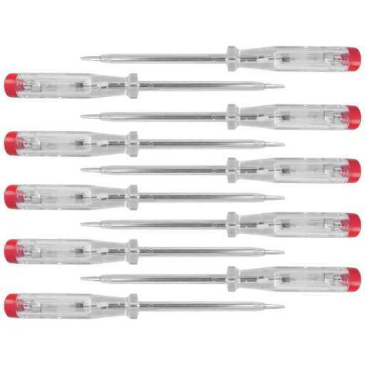 VDE feszültségvizsgáló Áramvizsgáló Áramvizsgáló 220 - 250 V a DIN VDE 0680 6. rész szerint: 1977-04. A penge anyaga kiváló minőségű króm-vanádium acél, nikkelezett és nagyrészt szigetelt. Az ergonómikusan kialakított műanyag fogantyú szintén teljesen szigetelt, csúszásgátlóval és kapcsos, belül funkcionális világítással teljesen átlátszó.