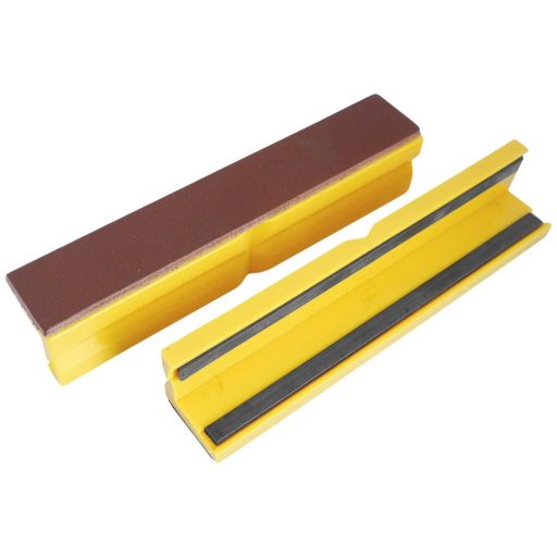 Jellemzők: 150 mm széles satupofákhoz alkalmas · mágnescsíkokkal vagy mágneses pontokkal · az egyik oldal a karcolásra érzékeny felületű alkatrészek rögzítéséhez · másik oldal prizmákkal, hornyokkal az ovális és kerek részek rögzítéséhez · BŐR = kopásálló, optimális kopásállóság, vízálló · Műanyag, sárga barna bőrborítással, további védőpofákkal, 9-900 keresőmező