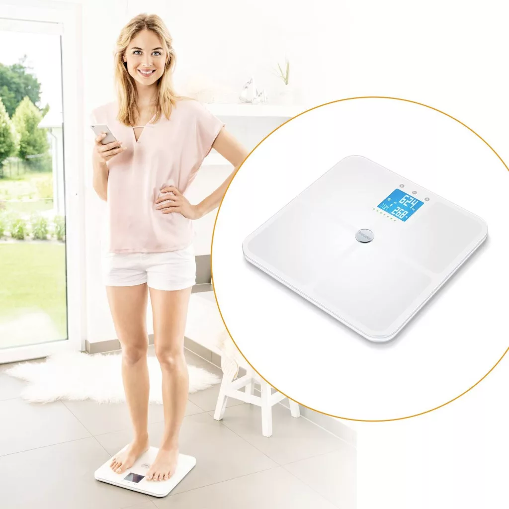Műszaki adatok: Adatátvitel: Bluetooth · Adatértékelés: Android alkalmazás, iOS alkalmazás · Anyag (lépőfelület): Biztonsági üveg · Gyártói szín: Fehér · Kijelző (digitális/mechanikus/analóg): digitális · Memóriahelyek: 8 · Méret, hossz: 320 mm · Méret, magasság: 24 mm · Méret, szélesség: 320 mm · Mértékegység: kg, lb, st · Mérési tartomány (max.): 180 kg · Testanalizáló funkciók: Súly, BMI meghatározás, Kalória, Csontsúly, Testzsír, Testvíz, Izomtömeg · Tápellátás: 4 db mikroelem (vele szállítjuk)
