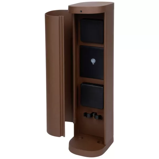 Műszaki adatok: 2021-es energiahatékonysági osztályok: n.rel. · Alkalmazás helye: Kültér · Anyag: Alumínium · Csatlakozási teljesítmény (max.): 3680 W · Dugaljak száma: 2 · Gyártói szín: Rozsda · Hálózati csatlakozó típus: Dugó nélkül · Hálózati elosztó jellemzők: Vezeték nélkül, Kapcsolóval, Időzítővel, Alkalmazással vezérelhető, Programozható · Kivitel (általános): WLAN-nal · Méret, hossz: 13.5 cm · Méret, magasság: 38.5 cm · Méret, szélesség: 9.5 cm · Szerelési mód: Padló