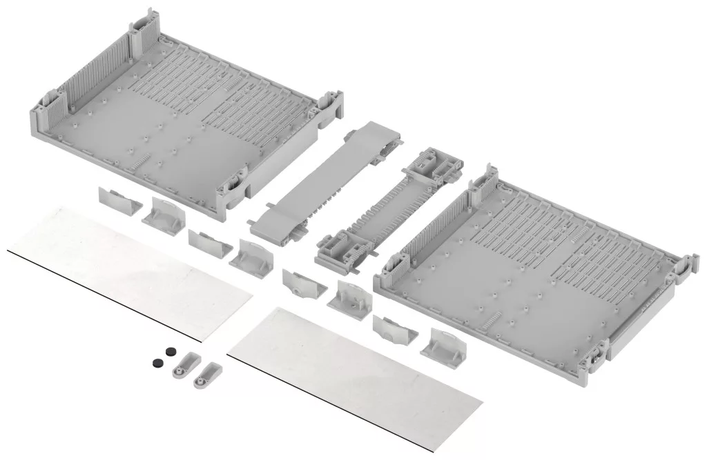 A ház belsejében az oldalfalakon további hornyok találhatók áramköri lapok, szerelőlapok stb.