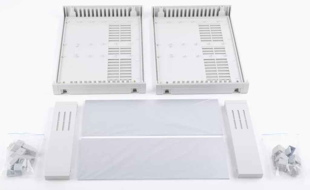 A klasszikus asztali házrendszer két ABS-ből készült műanyag félhéjból és alumínium előlapokból áll. A ház minden alkatrésze kiváló minőségű sárgaréz menetes betétekkel van összecsavarva. Így garantált a tartósan megbízható nyitás és zárás. Nyomtatott áramköri lapokhoz (vízszintes és függőleges) tartók széles választéka kapható a belső térben.