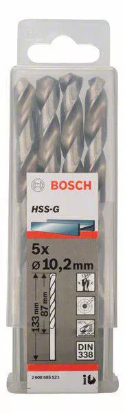 Műszaki adatok: Anyag: HSS · Anyag alkalmasság: Fém,Műanyag,Színesfém · Anyagjellemző: Csiszolt · DIN szabvány: DIN 338 · Furatátmérő: 10.2 mm · Fúró típus: Fém spirálfúró · Munkahossz: 87 mm · Szakítószilárdság (max.): 900 N/mm² · Szerszám tartó: Henger szár · Szár átmérő: 10.2 mm · Tartalom: 5 db · Teljes hossz: 133 mm