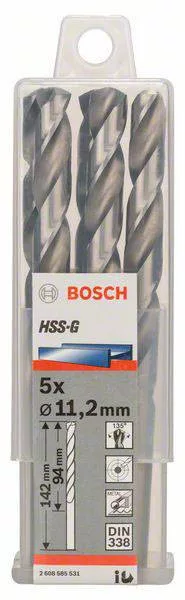 Műszaki adatok: Anyag: HSS · Anyag alkalmasság: Fém,Műanyag,Színesfém · Anyagjellemző: Csiszolt · DIN szabvány: DIN 338 · Furatátmérő: 11.2 mm · Fúró típus: Fém spirálfúró · Munkahossz: 94 mm · Szakítószilárdság (max.): 900 N/mm² · Szerszám tartó: Henger szár · Szár átmérő: 11.2 mm · Tartalom: 5 db · Teljes hossz: 142 mm