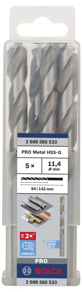 Műszaki adatok: Anyag: HSS · Anyag alkalmasság: Fém,Műanyag,Színesfém · Anyagjellemző: Csiszolt · DIN szabvány: DIN 338 · Furatátmérő: 11.4 mm · Fúró típus: Fém spirálfúró · Munkahossz: 94 mm · Szakítószilárdság (max.): 900 N/mm² · Szerszám tartó: Henger szár · Szár átmérő: 11.4 mm · Tartalom: 5 db · Teljes hossz: 142 mm