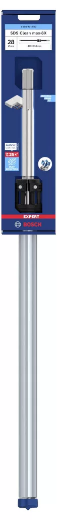 Fúrás vasbetonban továbbfejlesztett porcsökkentéssel! 4 vágóélű tömör keményfém fej segítségével behatol a vasbetonba. A precíz lyukak betonba fúrása csak egy lépés a vegyi horgonyok felszerelésében. A következő lépés az időigényes takarítási munka. Az EXPERT SDS Clean max-8X segítségével minden más lesz. A rendszer egyszerre fúr lyukakat és távolítja el a port. Ez felgyorsítja és leegyszerűsíti a vegyi horgonyok felszerelését. Az EXPERT SDS Clean max-8X fúrókat építőipari munkások és szerelők számára fejlesztettük ki, akiknek lyukakat kell fúrniuk a vegyi horgonyokhoz. A fúró 4 vágóéles tömör keményfém fejjel és robusztus porszívócsővel van felszerelve. A tartozékokat az SDS Clean max csatlakozóval együtt használják, amely minden SDS Clean max-8X fúróhoz alkalmas, és ugyanolyan könnyen felszerelhető, mint eltávolítható. Így egy nagy teljesítményű fúrót kap, amely könnyen tisztítható, ha eltömődött (csak távolítsa el a szívócsövet a fúróból), valamint egy új porcsökkentő technológiát, amely lehetővé teszi a lyukak gyorsabb előkészítését a vegyszeres tiplik számára, és tisztább levegőt biztosít a munkahelyen. Rendkívül hatékony poreltávolítás a Bosch részecskekontroll segítségével.