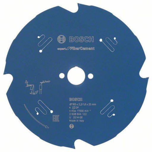 Műszaki adatok: Anyag alkalmasság: Cementrost · Fog forma: Trapéz fogazás · Fogak száma (collonként): 4 · Fordulatszám (max.): 11500 fordulat/perc · Furat átmérő: 20 mm · További műszaki adatok: Vágási szélesség: 2.2 mm · Vastagság: 1.6 mm · Átmérő: 165 mm