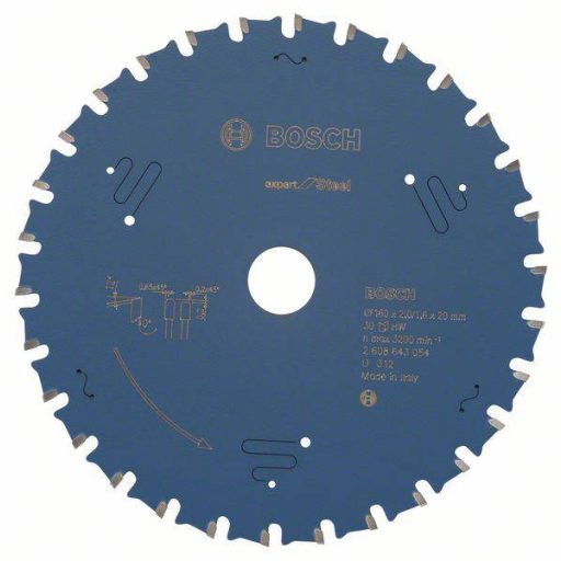 Az Expert for Steel körfűrészlap óriási ütésállósággal rendelkezik az acél ellen. Az egyedülálló, különösen kemény Microteq fogakat házon belül gyártják a Boschnál rendkívül robusztus keményfém szemcsékből a nagy teljesítmény biztosítása érdekében. Ezt a teljesítményt segíti a penge védőbevonata, amely megakadályozza a korróziót és megbízható vágást tesz lehetővé, miközben csökkenti a súrlódást. A termék csillapító résekkel van felszerelve a különösen sima futáshoz, lényegesen kevesebb zajhoz és érezhetően alacsonyabb rezgéshez. Az Expert for Steel körfűrészlap MTCG fogkonfigurációval rendelkezik (Multi-Purpose Triple Chip Grind), amely hosszú élettartamot biztosít. Külső átmérő hüvelyk: 6 1/4, külső átmérő mm: 160, furat mm: 20, vágási szélesség (b1) mm: 2,0, penge vastagság (b2) mm: 1,6, vágási szélesség (b1) mm / kés vastagság (b2) mm: 2,0 / 1,6, fogak száma: 30, fogforma: MTCG, max. Forgási sebesség (fordulat / perc): 3200, vágási eredmény: 2, ferde szög ° w1: 0, hasítási szög ° w2: 12