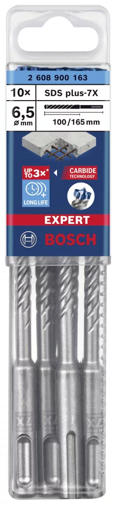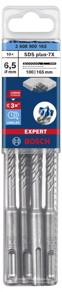 Műszaki adatok: Anyag alkalmasság: Beton, Kő, Gránit, Gneisz · Anyagjellemző: Keményfém betét · Furatátmérő: 6.50 mm · Kivitel (Bosch): Bosch Professional (blauw) · Mennyiség megadása: 10 részes · Munkahossz: 100 mm · Szerszám tartó: SDS-Plus · Teljes hossz: 165 mm