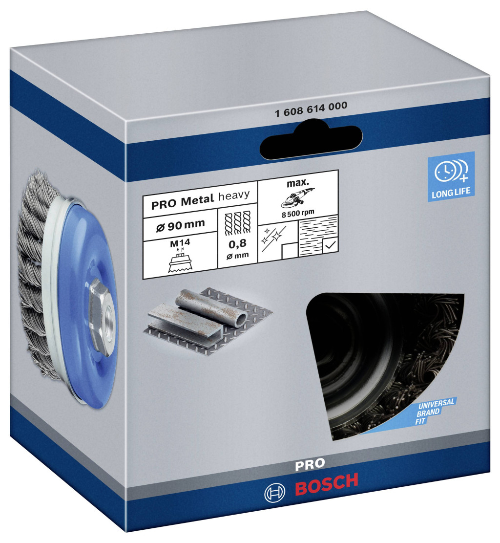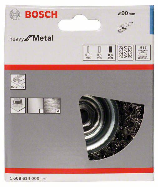 Fazékkefe – fonott drót. Alkalmas nehéz tisztítási munkákra közepes méretű és nagy fémfelületeken, mint például vastag rozsda vagy alvázvédelem eltávolítása, lakk vagy festék lemunkálása.. Megfelelő a következőhöz: sarokcsiszolók M 10-es vagy M 14-es menettel. 90 mm, 0,8 mm, M14.