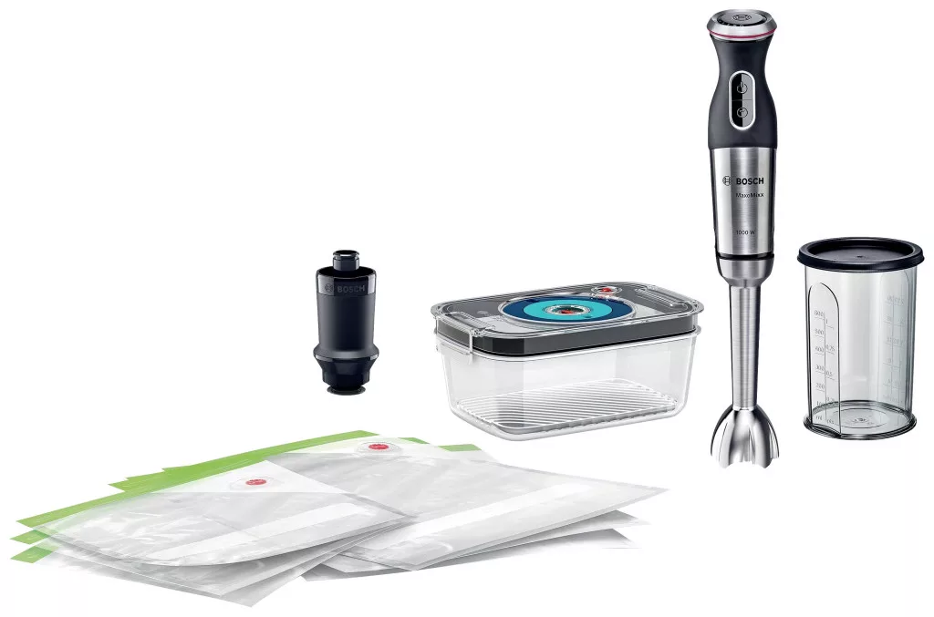 Szállítás tartalma: Bosch MS8CM61V1 botmixer, 1 * Fedő, 1 x turmixgép/mérőpohár, 1 x botmixer rúd rozsdamentes acél, 3 db nagyméretű vákuumcipzáras táska, 3 x vákuumos cipzáras táska kicsi, 1 x vákuum friss tároló doboz négyszögletes 1,2l, 1x vákuumszivattyú, Használati útmutató
