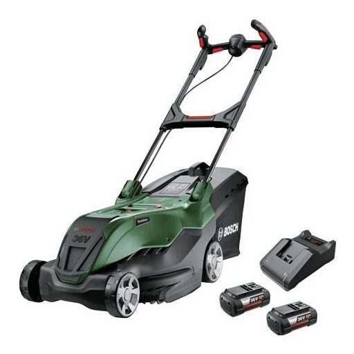 Akkus fűnyíró AdvancedRotak 36V-44-750. Erős akkumulátoros fűnyíró a kiváló fűnyírásért és a levágott fű összegyűjtéséért. Kiváló vágási teljesítmény és hosszabb élettartam a szénkefe nélküli motornak köszönhetően. Kényelmes manőverezés és egyszerű tárolás az Ergoflex fogantyúknak és az Ergoslide rendszernek köszönhetően. Kiváló minőségű textil fűgyűjtő teli jelzővel. Syneon technológia az optimális teljesítmény és a maximális üzemidő érdekében. Kompatibilis a Bosch 36 V-os POWER FOR ALL akkumulátorral. 2 db 36 V-os, 4,0 Ah-s akkumulátor. AL 36V-20 töltő