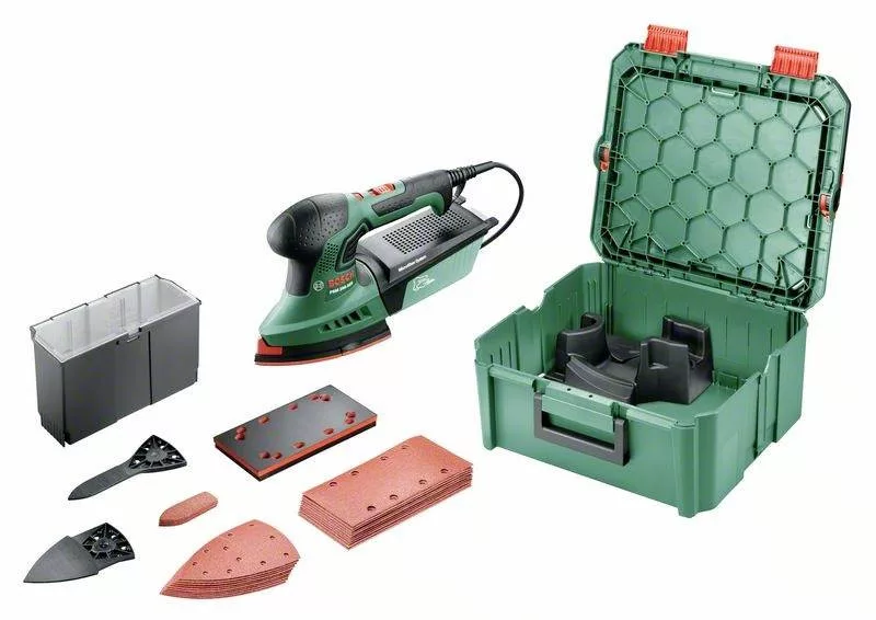 Többszörös csiszoló PSM 200 AES + SystemBox. Erőteljes multicsiszoló csiszolólap opciókkal és sebességszabályozással. Tartalmazza a háromszög- és négyszögletes csiszolólapot sokféle projekthez, Könnyű és gyors csiszolótartozékcsere az SDS rendszernek köszönhetően, Elektronikus fordulatszám-előválasztás biztosítja a tökéletes sebességet a munkának és az anyagnak megfelelően, Ideális közepes és nagy sík felületek csiszolásához is mint sarkok és élek. Fából vagy fémből készült, valamint festett és üvegezett felületek megmunkálásához, Single SystemBox, M méret (1 600 A01 SR4), Közepes tartozékdoboz, M méret (1 600 A01 V7R), Keskeny csiszolólap hosszabbító (2 608 000 199) ), Csiszolólap hosszabbító ( 2 608 000 200), csiszolólapok P 80, 5 db. (2 609 256 A38), 10 db. Csiszolópapír készlet P 80 - vas alakú csiszolólaphoz (2 609 256 A63), 10 db. Csiszolópapír készlet P 80 – négyszögletes csiszolólaphoz (2 609 256 A82), karton