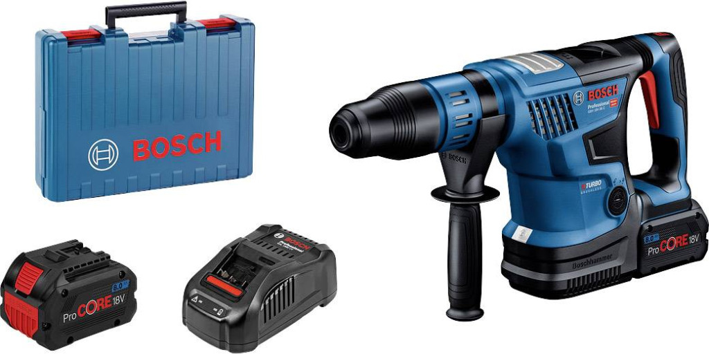 BITURBO akkus fúrókalapács SDS max GBH 18V-36 C-vel. Kiemelkedő tömörség és teljesítmény: a Bosch SDS max GBH 18V-36 C Professional akkus kalapács. Rendkívül kompakt: sokkal kompaktabb, mint bármely más, a piacon kapható SDS max akkus kalapács. Maximális teljesítmény és könnyű kialakítás: BITURBO kefe nélküli kalapács kefe nélküli motorral, ProCORE18V akkumulátorral és maximum 7,0 J csúcsteljesítménygel 6,1 kg-nál. Rendkívül intelligens: felhasználói felület és Bluetooth-csatlakozás puha indítással és kapcsolózárral kombinálva az állandó vésés érdekében. A csomag tartalma: 2 x ProCORE18V 5.5Ah akkumulátor (1 600 A02 149), gyorstöltő GAL 1880 CV (1 600 A00 B8G), 1 x Bluetooth Low Energy Module GCY 42 Professional (1 600 A01 3WF), kiegészítő fogantyú (2 608 000 702 ), Gépszövet (ET-szám: 1 619 200 413), zsírcső (ET-szám: 1 615 430 010), kézműves tok (ET-szám: 1 605 438 1G2)