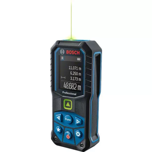 Műszaki adatok: Funkciók (mérőszerszámok): Területszámítás, Folyamatos mérés, Térfogatszámítás, Közvetett mérés (Pithagorasz) · Kalibráció: ISO · Lézer-hullámhossz: 515 nm · Lézerosztály: 2 · Memória (szöveg): 10 · Méret, hossz: 29 mm · Méret, magasság: 119 mm · Méret, szélesség: 53 mm · Mértékegység: mm, cm, m, ft, in · Mérési idő (max.): 4 mp · Mérési tartomány (max.): 50 m · Mérési tartomány (min.): 0.05 m · Mérőszerszám jellemzők: Állványadapter, 6,3 mm (1/4") · Pontosság: 1.5 · Súly: 0.200 kg · Súly, megjegyzés: Akkuk/elemek nélkül · Típus: GLM 50-25 G · Védelmi típus: IP65