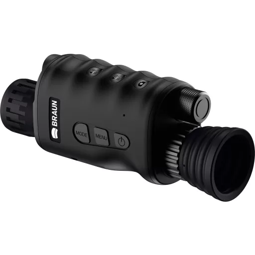 A BRAUN Night Vision 4.0 egy praktikus, digitális éjjellátó készülék, amely fényképek és videofelvételek készítésére is alkalmas. A fényes ULTRALIT objektív és a rendkívül érzékeny STARLIGHT CMOS érzékelő, valamint az erős, kapcsolható infravörös fényforrás kölcsönhatása lehetővé teszi a használatot nappali fényben, szürkületben és teljes sötétségben. Az infravörös világítás hét fokozatban állítható, és akár 250 méteres megfigyelési távolságot tesz lehetővé éjszaka is. A beépített 4x digitális zoom lehetővé teszi a nagyon távoli tárgyak megtekintését is. A Night Vision 4.0 elektronikus keresője 3x-os szemlencse-nagyítást tesz lehetővé dioptria-kompenzációval és gumi szemkagylóval, így a készülék távcsőhöz hasonlóan közvetlenül a szem elé helyezhető. Ezzel elkerülhető, hogy megvilágítsa magát a kereső kijelzőjén keresztül – ahogy ez elkerülhetetlen a szemlencse nélküli éjjellátó készülékeknél. A Night Vision 4.0 opcionálisan megvásárolható Micro SD kártyára menti a fényképeket és videófelvételeket, és akár Full HD felbontásban is készíthető videók. A víz- és porvédett éjjellátó készülék intuitív módon, egy kézzel is kezelhető, a mellékelt ergonomikus kézszíj pedig további stabilitást biztosít a kezelés során. Az áramellátás a mellékelt 18650-es lítium-ion akkumulátoron keresztül történik, az USB-csatlakozás segítségével pedig bármely szabványos power bank könnyen csatlakoztatható.