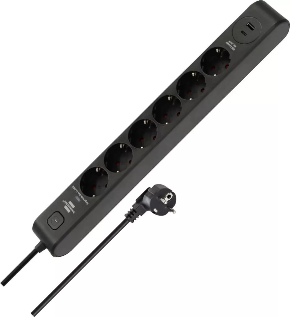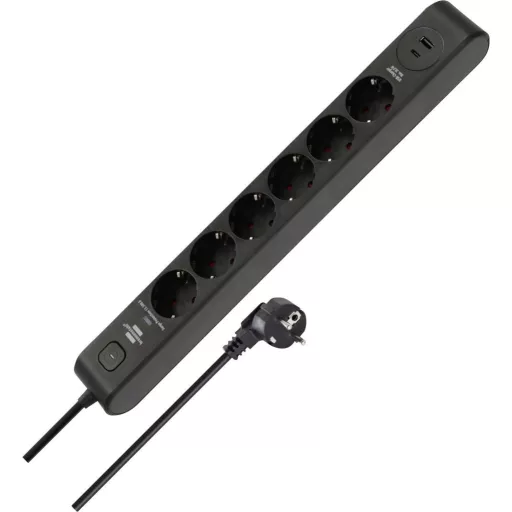 Technical specifications: Alkalmazási terület: Beltér,Aljzat dugó · Dugaljak száma: 6 · Hálózati csatlakozó típus: Védőérintkezős · Hálózati elosztó jellemzők: Gyermekvédelem,#####mit USB-C®,USB töltőkimenettel,#####Power Delivery,Túlfeszültség elleni védelem · Kábel típus DIN/VDE szerint: H05VV-F 3G 1,5 mm² · Kábelhossz: 2 m · Méret, hossz: 470 mm · Méret, magasság: 50 mm · Méret, szélesség: 90 mm · Szín: Fekete,Antracit · További műszaki adatok: