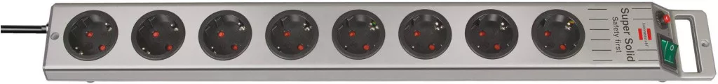 A Brennenstuhl Super-Solid többcsatlakozós szalag minőségével és biztonságával minden területen lenyűgöz. A kapcsolóval szemben található speciális kábelbemenet különösen megkönnyíti ennek az elosztónak a működtetését, például az asztal alatt.