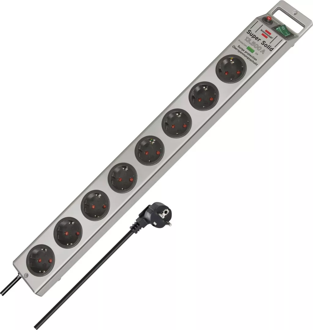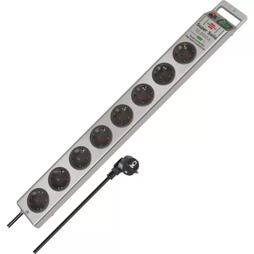 A Brennenstuhl 8-utas Super-Solid többcsatlakozós szalag ezüst színben és 2,5 m-es kábellel minden területen lenyűgöz minőségével és biztonságával. A kapcsolóval szemben található speciális kábelbemenet különösen megkönnyíti ennek az elosztónak a működtetését, például az asztal alatt. Nem csak fokozott védelmet nyújt a véletlen érintés ellen.