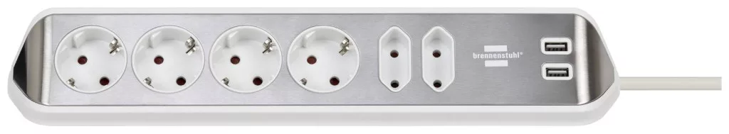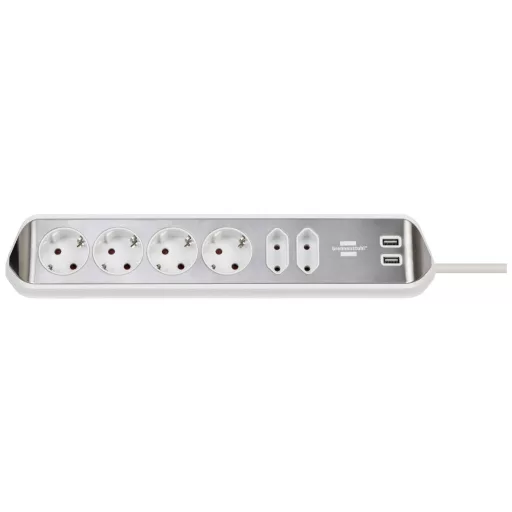 Műszaki adatok: Alkalmazás helye: Beltér · Dugaljak száma: 10 · Gyártói szín: Ezüst, Fehér · Hálózati csatlakozó típus: Védőérintkezős · Hálózati elosztó jellemzők: USB-vel, Gyermekvédelem · Kivitel (általános): 4 x Schuko, 2 x Euro, 2 x USB · Kábel típus DIN/VDE szerint: H05VV-F 3G 1,5 mm² · Kábelhossz: 2.00 m · Üzemi feszültség: 230 V