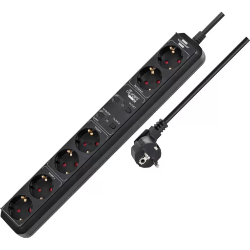 Technical specifications: Alkalmazási terület: Beltér,Aljzat dugó · Dugaljak száma: 4,2 · Hálózati csatlakozó típus: Védőérintkezős · Hálózati elosztó jellemzők: Gyermekvédelem,Alkalmazással vezérelhető,Kapcsolóval · Kábel típus DIN/VDE szerint: H05VV-F 3G 1,5 mm² · Kábelhossz: 1.5 m · Méret, hossz: 450 mm · Méret, magasság: 50 mm · Méret, szélesség: 100 mm · Szín: Fekete · További műszaki adatok:
