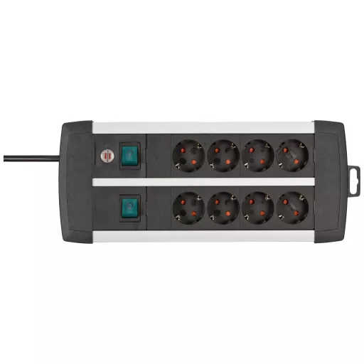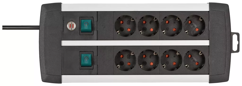 Műszaki adatok: Alkalmazás helye: Beltér · Anyag: Alumínium · Dugaljak száma: 8 · Gyártói szín: Fekete, Ezüst · Hálózati csatlakozó típus: Védőérintkezős · Hálózati elosztó jellemzők: Gyermekvédelem, 2 kapcsolóval, Felakasztó füllel · Kivitel (általános): Kétszer négyszeres · Kábel típus DIN/VDE szerint: H03VV-F 3G 1,5 mm² · Kábelhossz: 3.00 m · Méret, hossz: 355 mm · Működés jelző: Optikai · Szerelési mód: Szabadon álló · Üzemi feszültség: 230 V
