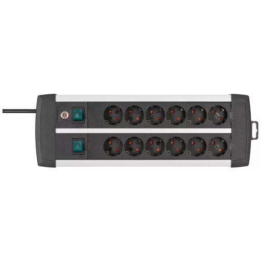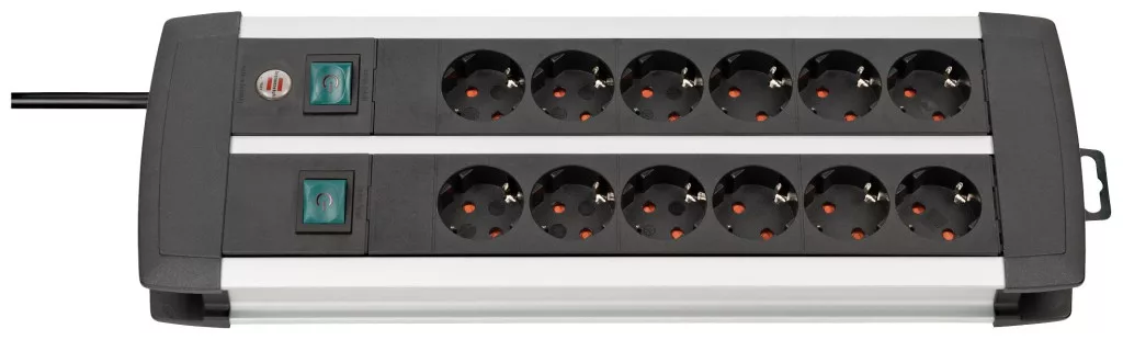 Műszaki adatok: Alkalmazás helye: Beltér · Anyag: Alumínium · Dugaljak száma: 12 · Gyártói szín: Fekete, Ezüst · Hálózati csatlakozó típus: Védőérintkezős · Hálózati elosztó jellemzők: Gyermekvédelem, 2 kapcsolóval, Felakasztó füllel · Kivitel (általános): 2x hatszorosa · Kábel típus DIN/VDE szerint: H03VV-F 3G 1,5 mm² · Kábelhossz: 3.00 m · Méret, hossz: 355 mm · Működés jelző: Optikai · Szerelési mód: Szabadon álló · Üzemi feszültség: 230 V