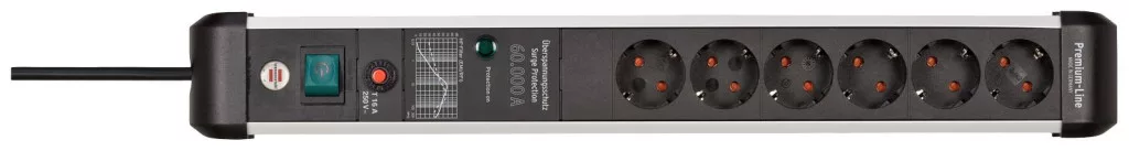 A Brennenstuhl 6-utas Premium Protect Line többcsatlakozós szalag ezüst/fekete színben és 5 m-es kábellel minden területen lenyűgöz minőségével és biztonságával. Nemcsak fokozott érintésvédelemmel rendelkezik, hanem a következő tulajdonságokkal is meggyőzi: