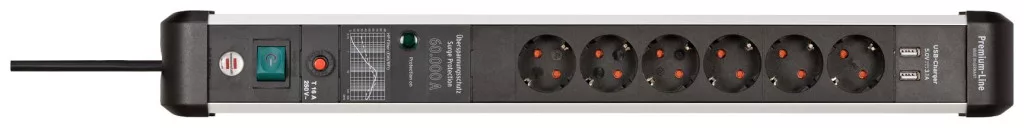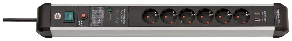 A Brennenstuhl Premium Protect Line 6 pólusú elosztósora ezüst/fekete színben, 2 USB töltőaljzattal és 3 m-es kábellel nemcsak fokozott érintésvédelmet biztosít, hanem a következő tulajdonságokkal is lenyűgöző: