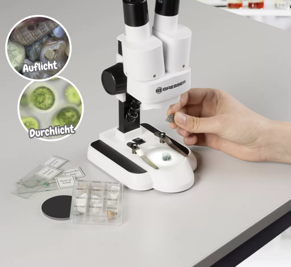 BRESSER Junior visszaverődő és áteresztett fénymikroszkóp 20 és 50-szeres nagyítással