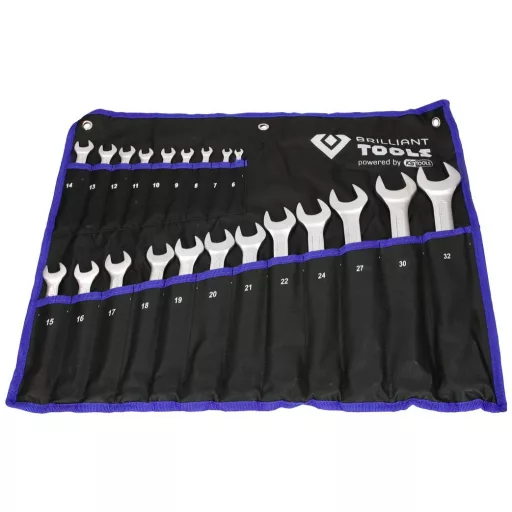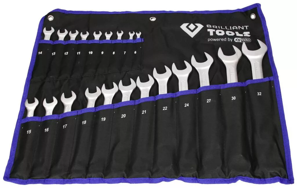 Króm-vanádium A 21 részes BRILLIANT TOOLS BT011021 kombinált csavarkulcs-készlet króm-vanádium acélból cseppkovácsolt, majd edzett. A felület matt krómozott a jobb rozsdavédelem érdekében, és a DIN 3113 A forma szerint készül, ami azt jelenti, hogy különösen jól illeszkedik a kézbe. A metrikus kombinációs kulcsok gyűrűs oldala 15°-os szögben és 15°-os pofapozícióval rendelkezik. Praktikus tárolótáskában, akasztóhurkokkal ellátva.