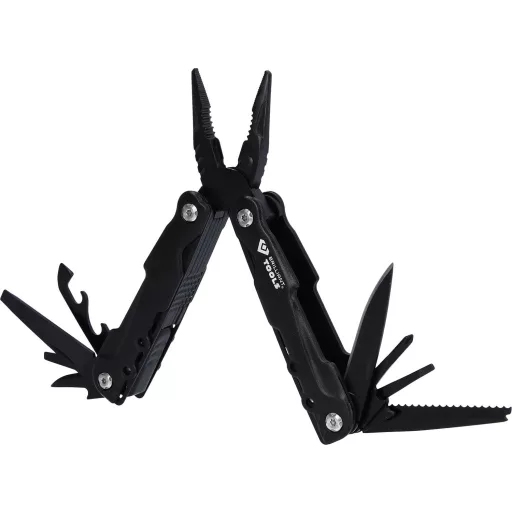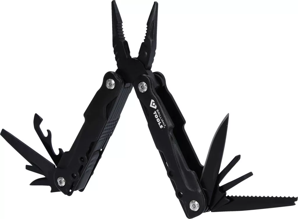 A BRILLIANT TOOLS többfunkciós fogó BT100903 egy kis szerszámosláda egy szerszámban. 14 különböző funkciójával tökéletes társ kempingezés vagy utazás közben is. A mart alumínium fogantyú összecsukva minden szerszámot tartalmaz. A funkciók részletesen: fogó, tűfogó, huzalvágó, kés, nagy laposfejű csavarhúzó, közepes laposfejű csavarhúzó, kis laposfejű csavarhúzó, szúrószerszám, reszelő, kis kés, PH1 csavarhúzó, sörnyitó, konzervnyitó és fűrész. Mindkét biztonsági zár reteszeli a szerszámokat, amikor ki vannak hajtva. Ez megakadályozza, hogy az ujjak véletlenül összecsukódjanak és összenyomódjanak. Ezenkívül a többfunkciós fogót övhurokkal ellátott tasakban szállítjuk. Az övre rögzítve mindig kéznél van.