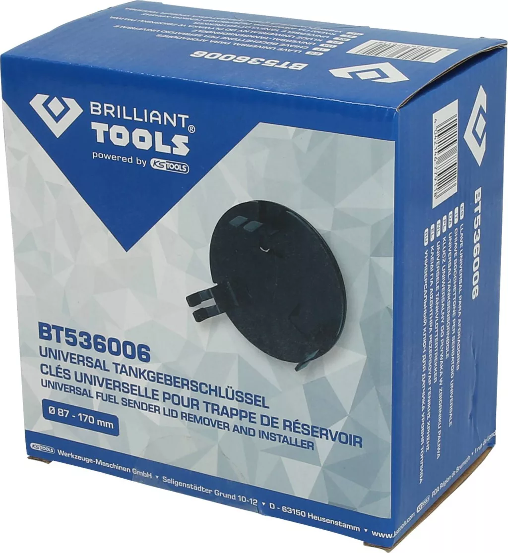 A BRILLIANT TOOLS BT536006 univerzális üzemanyagszint-mérő kulcs az üzemanyagszint-mérők vagy üzemanyag-szivattyúk legtöbb csavaros gyűrűjének össze- és szétszerelésére szolgál. Szűk helyekre tervezték. A 87 mm - 17 cm befogási tartomány szabadon állítható, és a zárógyűrűvel rögzíthető.
