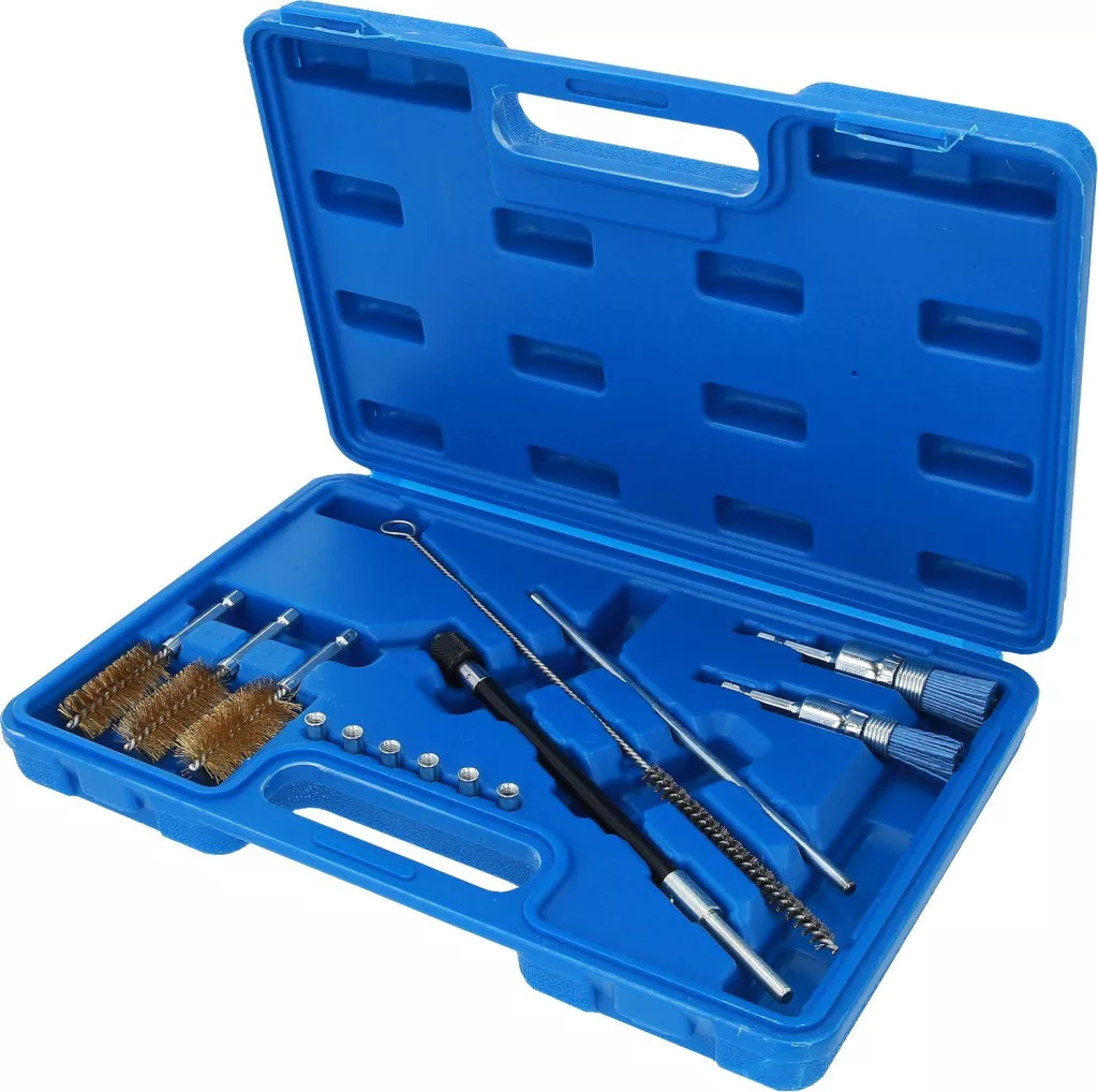 A BRILLIANT TOOLS injektorülés- és tengelytisztító készlet BT551380 tökéletes segítőtárs a korommaradványok eltávolításában. A mellékelt tömítődugók megakadályozzák, hogy a koromrészecskék az égéstérbe kerüljenek. Mind a nylon, mind a sárgaréz kefék akkus csavarhúzóval működtethetők. Az alapos tisztítás biztosítja az injektor tömítettségét.