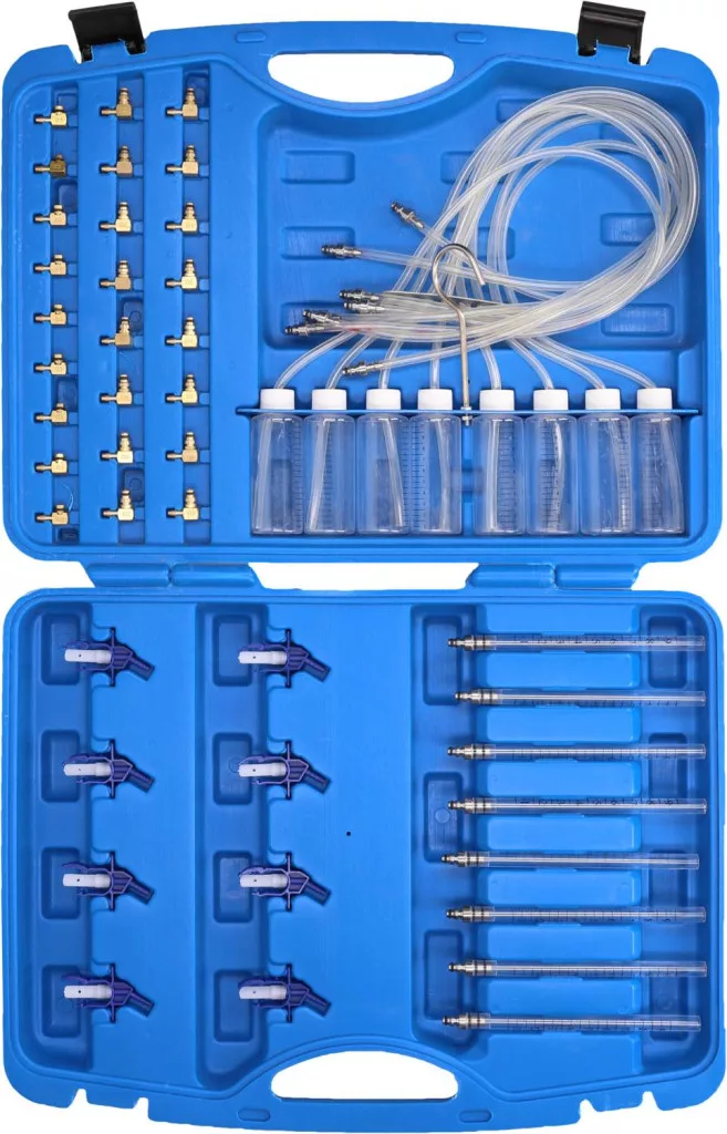 A BRILLIANT TOOLS BT581530 közös nyomócsöves teszter ideálisan alkalmas a közös nyomócsöves injektorok visszatérő áramlási sebességének meghatározására. Ha a motor nem indul, vagy csak rosszul indul, az egyik ok a befecskendezők szivárgása lehet. Ez a készlet alkalmas az injektorok visszatérő térfogatának meghatározására. A visszatérő áramlás opcionálisan visszafolyhat az üveglombikba vagy a mérőpohárba. A csomagban 40 adapter található, amelyek sokféle injektorhoz csatlakoztathatók.