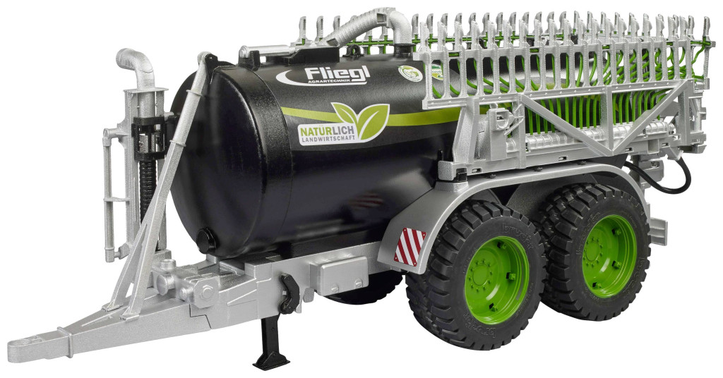 A Fliegl új dobos pótkocsija kibővíti a BRUDER mezőgazdasági kínálatát a műtrágyatechnológia jelenlegi állásával. A BRUDER részletes modellje húzótömlő-elosztó rendszerrel van felszerelve. Az integrált tartály vízzel feltölthető és fedéllel zárható. Az utánfutó ürítése a pótkocsi hátulján található leeresztő szelepen keresztül történik. A vontatótömlő-elosztó közúti szállításhoz felhajtható, majd a szántóföldön újra kihajtható. A BRUDER 3000-es és 4000-es sorozatának traktorai tökéletesek ehhez a lenyűgöző pótkocsihoz.