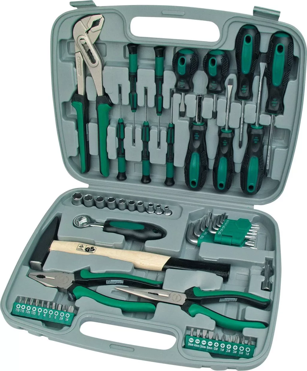 Jellemzők: Fogók, 2 komponensű markolat borítással, lecsúszás elleni védelemmel · Csavarhúzó, csúszásmentes markolattal · Penge, króm-vanádium acélból · Dugókulcs betét, imbuszkulcs és bitek króm-vanádium acélból.