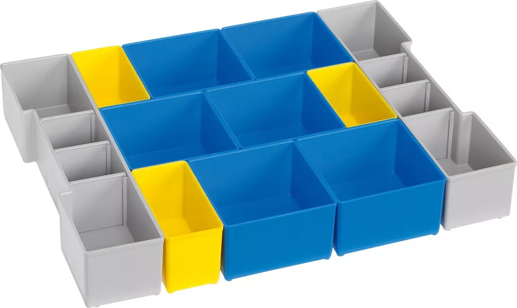 L-BOXX 102-hez / Tartalma: 2 db U3 betétdoboz, szürke, 6 válaszfallal, 3 db B3 sárga betétdoboz, 6 db C3 kék betétdoboz