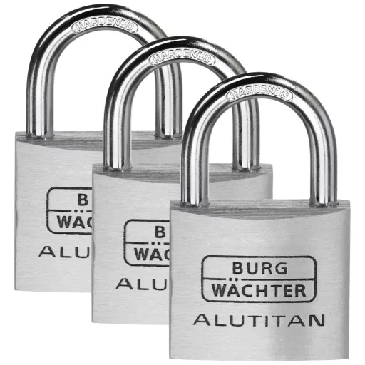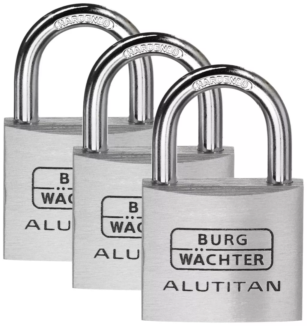 A praktikus és robusztus BURG-WÄCHTER Trio 770 40 SB lakatkészlet 3 azonos kulccsal rendelkező zárból és 4 kulcsból áll. A lakat tömör alumínium testű, a belseje rozsdamentes. A 770 ALUTITAN bilincse olyan kemény, mint az acél, és kettős reteszeléssel rendelkezik.