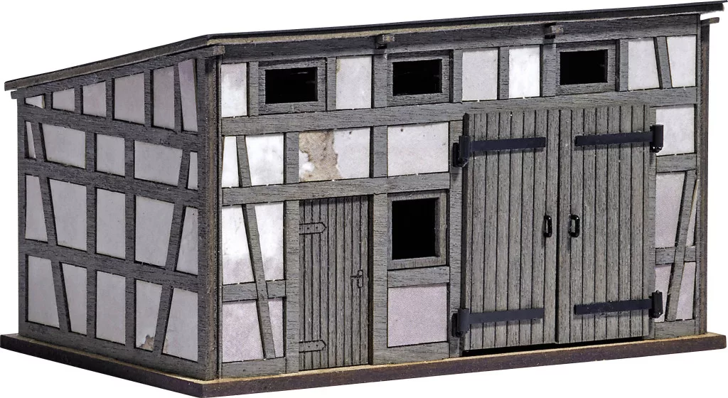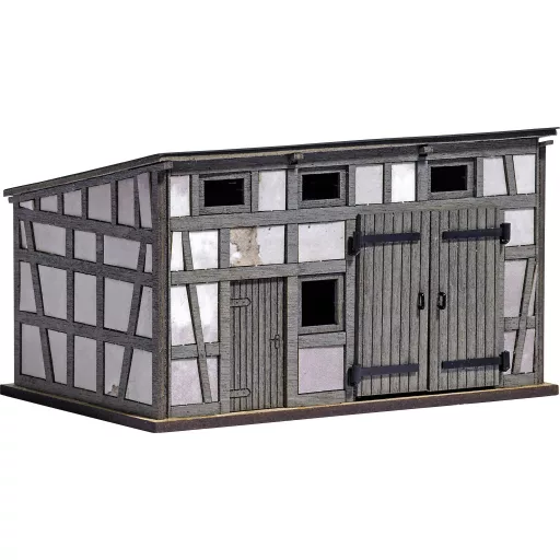 A hátsó udvari épület romos szerkezeti elemeit speciális kezeléssel alakították ki, hogy elveszett hely hatását keltsék, például az omladozó vakolat szuperrealisztikus 3D-s megjelenést kölcsönözve. A fa keret, az ajtó és a kapu valódi fából készült. Minden alkatrész teljesen kiszínezve. Univerzálisan alkalmazható, pl. műhelyként, garázsként, mosodaként, vasútállomások, szénüzemek és sok más számára
